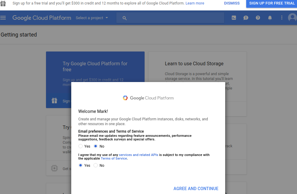 Figure 13.4.1.1 The first-time screen at https://console.cloud.google.com/start where you can see that they give you the option to sign up for a free trial.